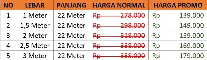 Variasi Lebar : 1 Meter, 1,5 Meter, 2 Meter, 2,5 Meter, dan 3 Meter